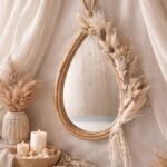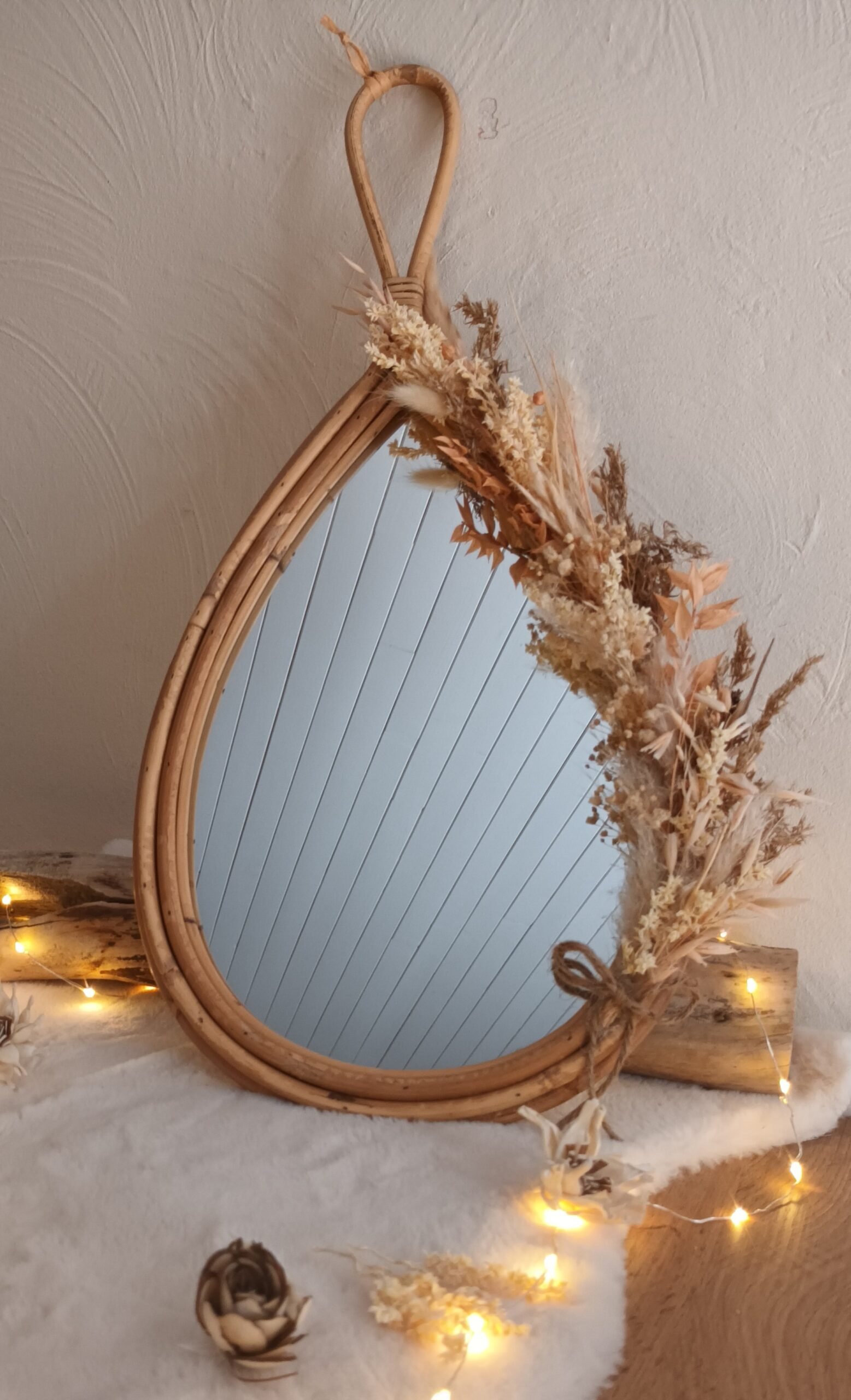Envie d’une touche de charme naturel et poétique à votre interieur, pourquoi pas avec ce joli miroir en rotin décoré de fleurs séchées.