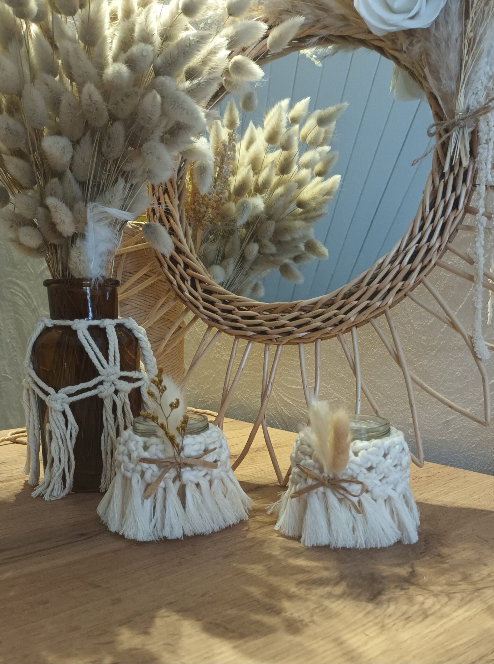 Petit photophore en macramé au style boheme, ils vont sublimer votre table lors de repas et ils mettront une ambiance apaisante.